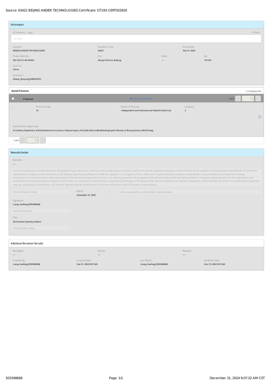 北京安達(dá)泰克科技有限公司實(shí)驗(yàn)室獲Nadcap和GEA S-400實(shí)驗(yàn)室認(rèn)證證書