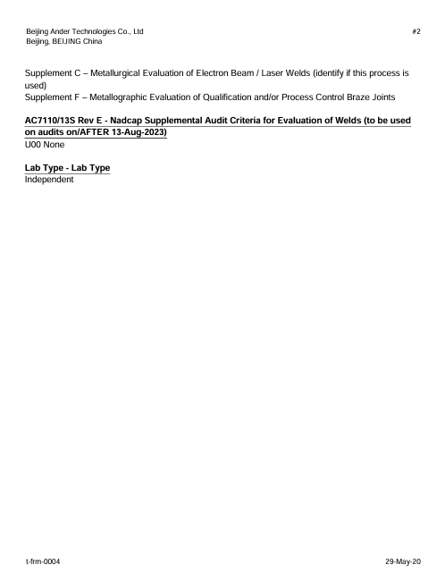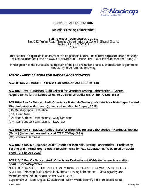 公司作為航空航天產(chǎn)品制造企業(yè),擁有多項(xiàng)通過Nadcap審核的特種工藝。理化檢測(cè)是特種工藝過程管控的必要手段和重要環(huán)節(jié)。為了更好的發(fā)展公司的核心競(jìng)爭(zhēng)力和為客戶提供更有效的產(chǎn)品質(zhì)量保證,北京安達(dá)泰克公司實(shí)驗(yàn)室在2024年4月通過CNAS認(rèn)可后,啟動(dòng)了PRI的Nadcap MTL 及 GEA的S400認(rèn)證申請(qǐng)。