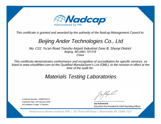 時(shí)間:2025-02-07 來源:Ander新春佳節(jié)剛過,北京安達(dá)泰克科技有限公司實(shí)驗(yàn)室就收到了PRI頒發(fā)的Nadcap MTL實(shí)驗(yàn)室認(rèn)證證書。至此,北京安達(dá)泰克科技有限公司實(shí)驗(yàn)室相繼通過GEA S-400和Nadcap實(shí)驗(yàn)室認(rèn)證,標(biāo)志著安達(dá)泰克實(shí)驗(yàn)室的技術(shù)和管理水平邁上了新臺(tái)階。